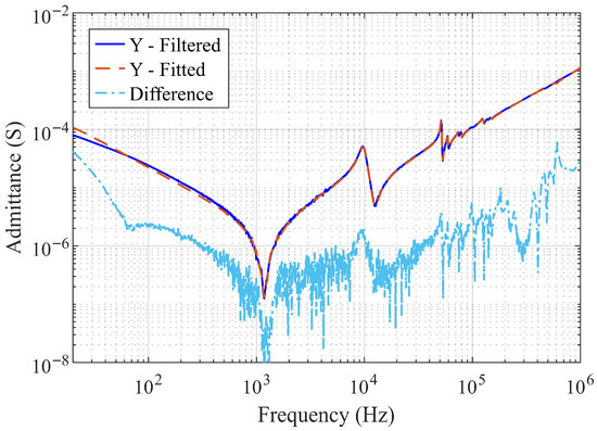 Figure 4, the region around the first anti-resonance frequency, approximately 1.2 kHz, exhibits noticeable noise. This behavior is attributed to the very low admittance (i.e., high impedance) in this frequency range due to parallel resonance, resulting in a minimal current measured by the instrument and a correspondingly low signal-to-noise ratio. To ensure robust application of the vector fitting algorithm, a smoothing process was applied to the data. Specifically, a moving average filter with a window length of 10 points was used between 1 kHz and 1.5 kHz.