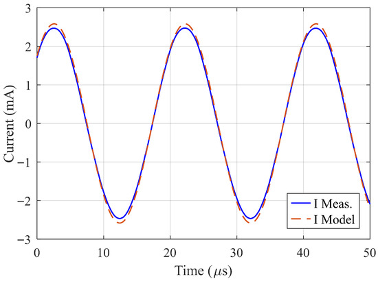 To validate the developed model in the time domain, its response was compared with measurements under sinusoidal excitation at the first resonance frequency (51 kHz). The excitation was applied to terminal H1, and the resulting internal voltages at taps T3 and T6, as well as the terminal current, were recorded and compared to simulation results. The voltage source consists of a signal generator (Tabor WW5064, Tabor Electronics, Nesher, Israel) connected to a power amplifier (Rohrer Hero-Power PA2023E, Rohrer Mess- & Systemtechnik, Munich, Germany). Voltage measurements were done using 10:1 passive probes (Lecroy PP005, Teledyne LeCroy, Chestnut Ridge, NY, USA), and the input current was measured with a current probe (Pearson 2100, Pearson Electronics, Palo Alto, CA, USA). All signals were acquired using a digital oscilloscope.