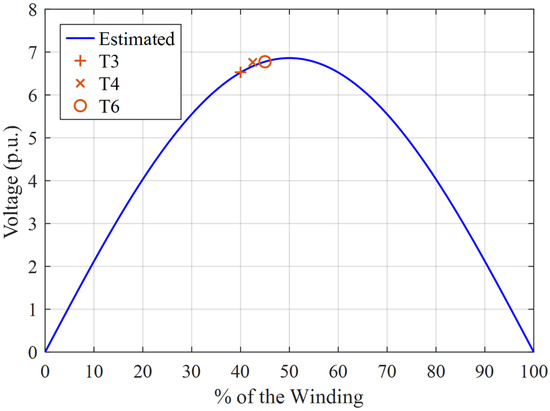 At the first-mode resonance, the model estimates a peak overvoltage of 6.86 p.u. at the winding midpoint. The calculated voltages at taps T3, T4, and T6 were 6.53 p.u., 6.76 p.u., and 6.78 p.u., respectively, which is in close agreement with the results obtained from frequency response measurements. These overvoltage magnitudes pose a serious risk to the winding insulation, potentially leading to dielectric failure between the winding and ground.