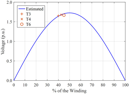The frequency-domain voltage transfer functions revealed two significant resonance frequencies at 51 kHz and 59 kHz, with respective gains of 6.9 and 1.7. Using the developed model, the voltage distribution along the winding can be estimated. Since the internal taps are located near the midpoint of the winding, as described in