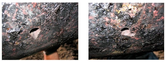 Metal loss can be calculated using Faraday’s Law []; e.g., a direct current with an intensity of 1 A dissolves approximately 9.6 kg of steel per year. So, electrolytic corrosion caused by stray currents can be very intense, even several mm/year. If the surface area where the current flows from the pipeline into the ground is small (a few cm2), then the density of the current dissolving the metal is very high, and perforation of the pipeline wall may occur after only a few months, even at a distance of several hundred meters from the tram traction []. Examples of electrolytic corrosion of underground pipelines are shown in the photos in Figure 1. The corrosion defects presented occurred on a DN300 (diameter nominal 300 mm) medium-pressure gas pipeline with bituminous insulation, running near the tram traction.