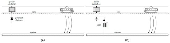 Reducing the impact of stray currents by implementing: (a) polarized electric drainage, (b) impressed current cathodic protection. (prepared based on the original figure from Ref. []).