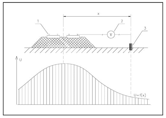 This is the simplest method for determining the zone of probable stray current impact on the gas pipeline in the area of the field measurement site. It does not require connecting measuring instruments (recorders) to the pipeline, but only to the electric traction rails. In this method, the potential of the rails relative to a portable reference electrode (e.g., Cu/CuSO4) is recorded, as schematically shown in Figure 3 [].