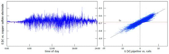 The risk of corrosion of a gas pipeline due to dynamic stray currents occurs when periods of anodic polarization of the gas pipeline prevail [,,]. If periods of cathodic polarization of the gas pipeline prevail, there is no risk [,]. The dynamically changing potential values recorded must therefore be analyzed and compared with the ‘base’ potential value of the gas pipeline, i.e., the potential of the gas pipeline in the absence of stray currents. This value is referred to as the stationary potential ES. One way to determine the ES potential is to measure its value at night when there is no electric locomotive traffic on the tram (or railway) traction. However, this is not necessary in the correlation method, as the ES value is determined by linear regression from the relationship E = f(U) and corresponds to the potential value calculated for zero voltage. At zero voltage, the stray current intensity is also zero, so this is the moment when there is no stray current influence. An example of a 24-h record of the gas pipeline potential in the zone of influence of dynamic stray currents and a correlation graph E = f(U) are shown in Figure 8. The ES value calculated by the linear regression method coincides with the average value of the gas pipeline potential during the night, when there is no electric locomotive traffic on the traction.