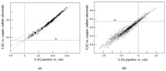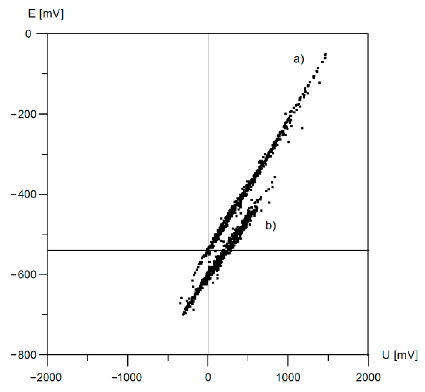 Examples of correlation charts E = f(U): (a) very high risk of stray currents to the gas pipeline, (b) no risk of stray currents.