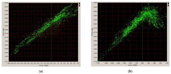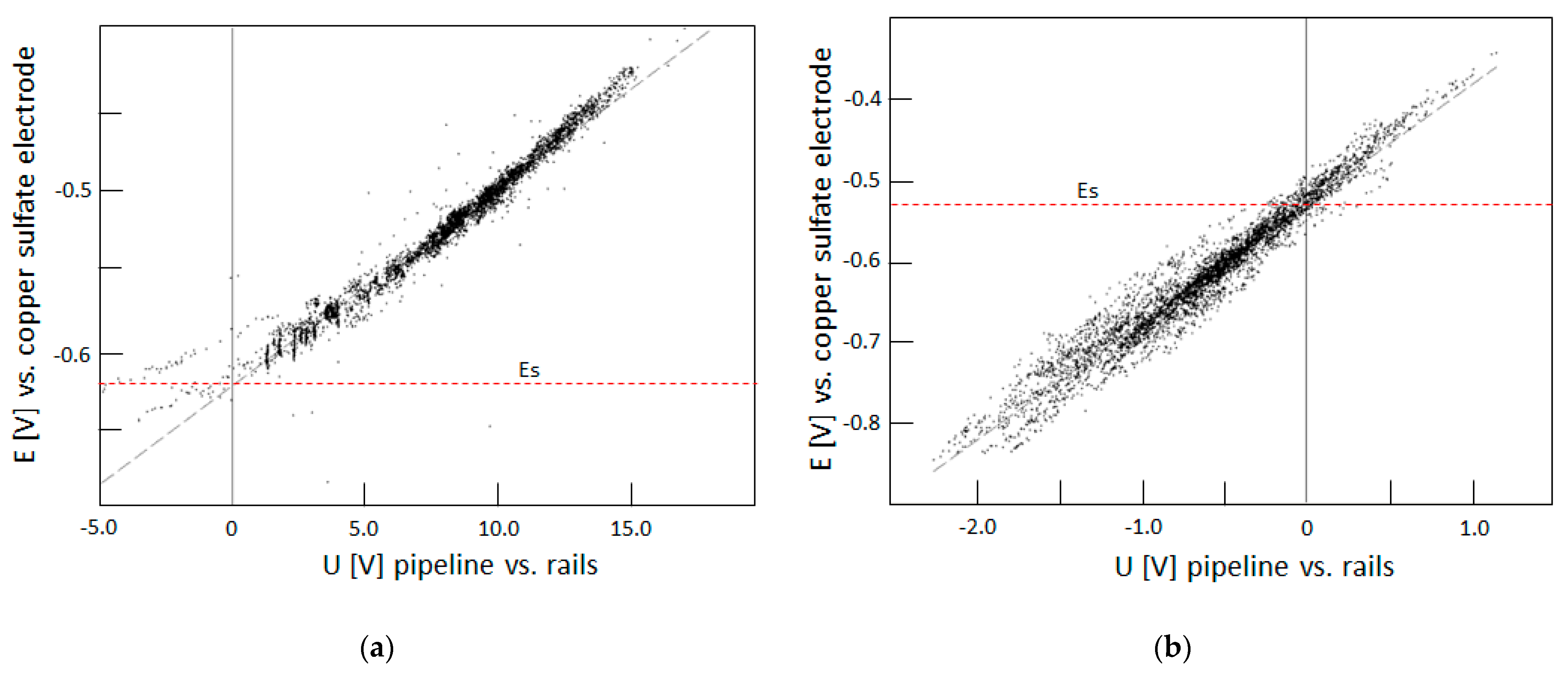 Examples of E = f(U) correlation graphs are shown in Figure 9. The graph in Figure 9a illustrates the high risk of stray currents to the gas pipeline, as there is a very large predominance of periods of anodic polarization of the gas pipeline (potential values higher than the stationary potential ES marked with a red dotted line). In turn, the graph in Figure 9b illustrates the absence of a threat to the gas pipeline at the measurement point—there is a predominance of cathodic polarization periods of the gas pipeline (potential values lower than ES prevail).
