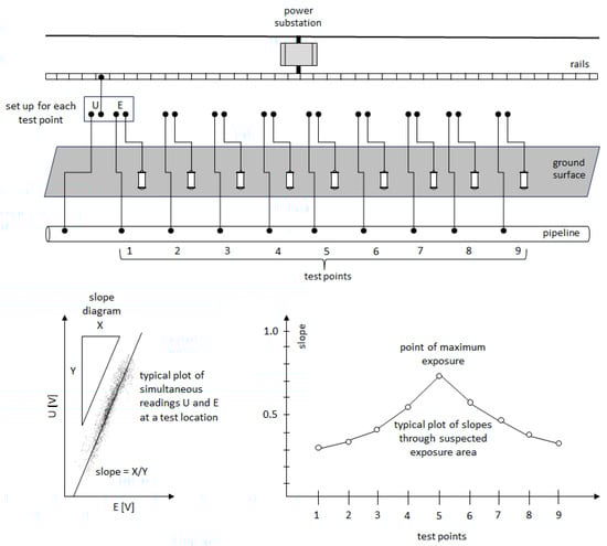 A variation of the correlation method discussed in the previous section is the method presented by Peabody []. The same signals are recorded, i.e., the potential of the gas pipeline E and its voltage relative to the traction rails U, but the inverse correlation relationship is analyzed: U = f(E). Conclusions about the intensity of the impact of stray currents on the gas pipeline are drawn based on the slope of the correlation spectrum, i.e., the angle of slope of the linear regression line—the so-called beta coefficient. The slope of the regression line is a measure of exposure: the greater the slope, the greater the exposure. Measurements are taken along the route of the gas pipeline running near the electric rail traction. The result of the research is the so-called ‘beta profile’ along the gas pipeline []. The point at which the beta coefficient is the highest is considered to be the place of greatest harmful impact of stray currents. The idea of taking measurements together with the beta profile is illustrated in Figure 12.