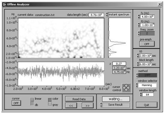 An example of time-frequency analysis is shown in Figure 13 and Figure 14 [], for the potential of tram rails and the potential of a gas pipeline vs. Cu/CuSO4 reference electrode, respectively. Analysis was performed with LabVIEW 7.1, Joint Time Frequency Analysis software package. A 30-min fragment has been presented of a potential time register and a corresponding STFT spectrogram—they are spectral line compositions of a determined frequency structure. The square of the STFT module yields the spectrogram, which is obtained in the time and frequency domains. Accordingly, it provides a measure of energy leakage from the tram traction. Appropriate time σt and frequency σω resolutions were acquired via selection of the analyzing window’s length according to the uncertainty rule provided by the Formula (9).