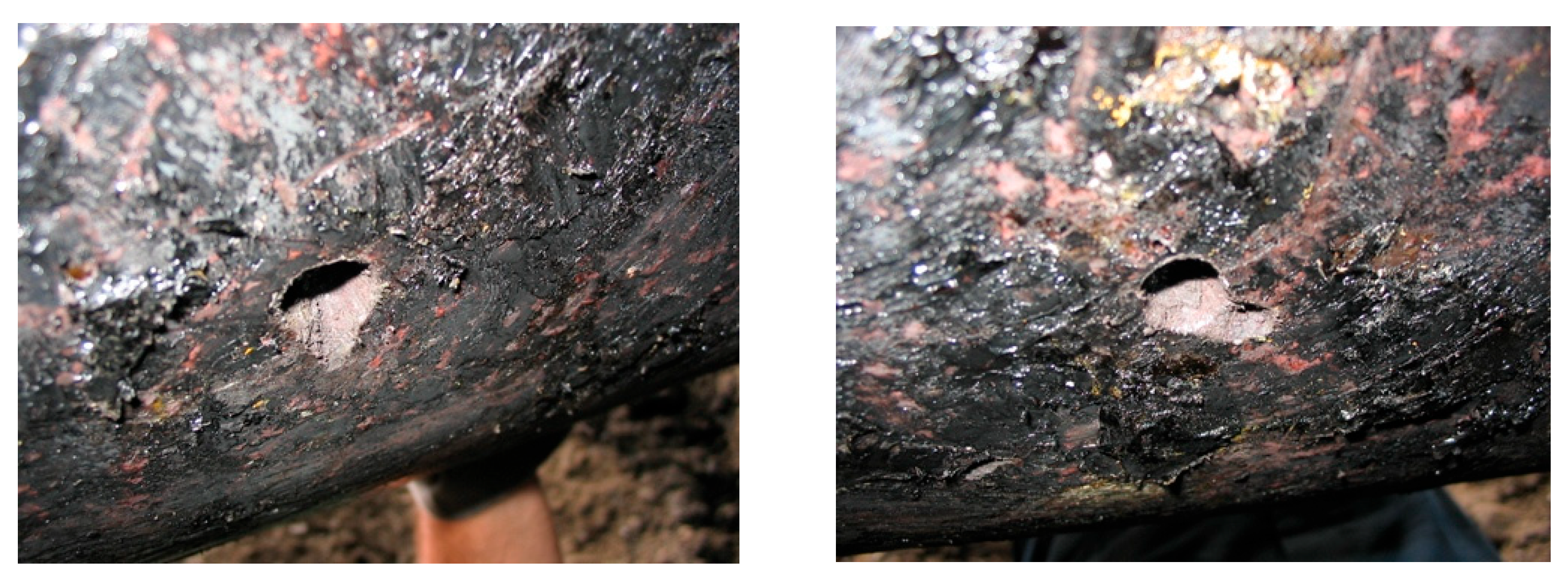 Examples of corrosion damage of pipelines caused by stray currents (from the authors’ photographic archives).