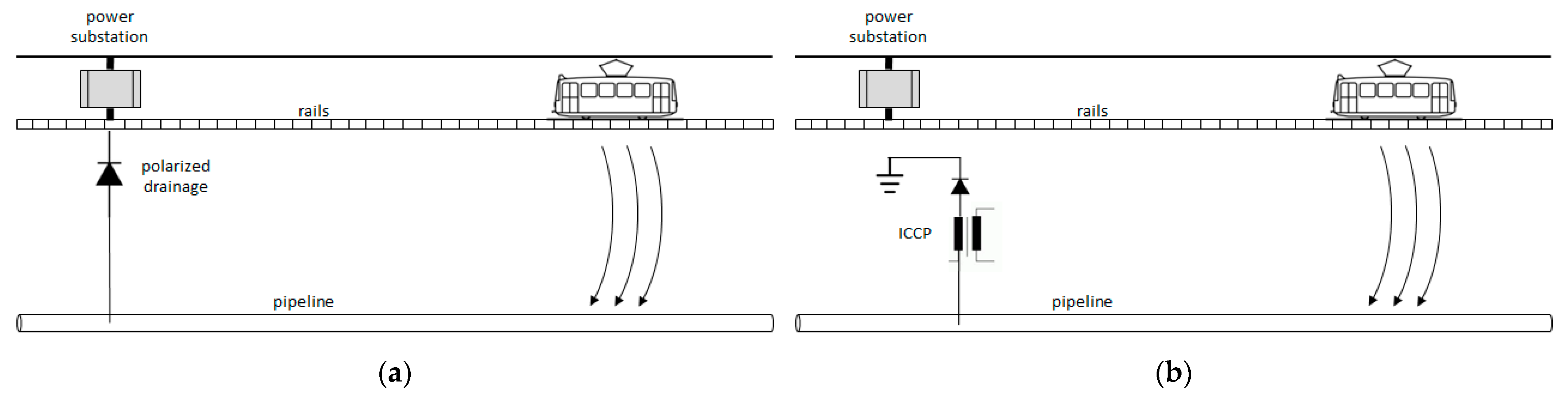 - Machczyński, W.; Budnik, K.; Szymenderski, J. Assessment of D.C. traction stray currents effects on nearby pipelines. COMPEL 2016, 35, 1468–1477. [Google Scholar] [CrossRef]