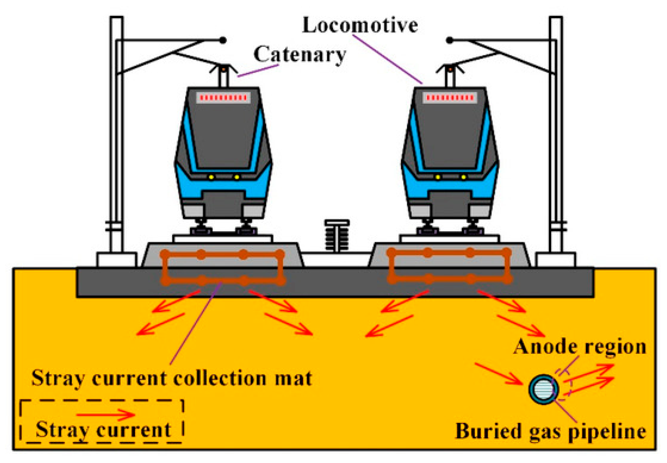 - Wang, C.; Li, W.; Wang, Y.; Xu, S.; Fan, M. Stray Current Distributing Model in the Subway System: A review and outlook. Int. J. Electrochem. Sci. 2018, 13, 1700–1727. [Google Scholar] [CrossRef]