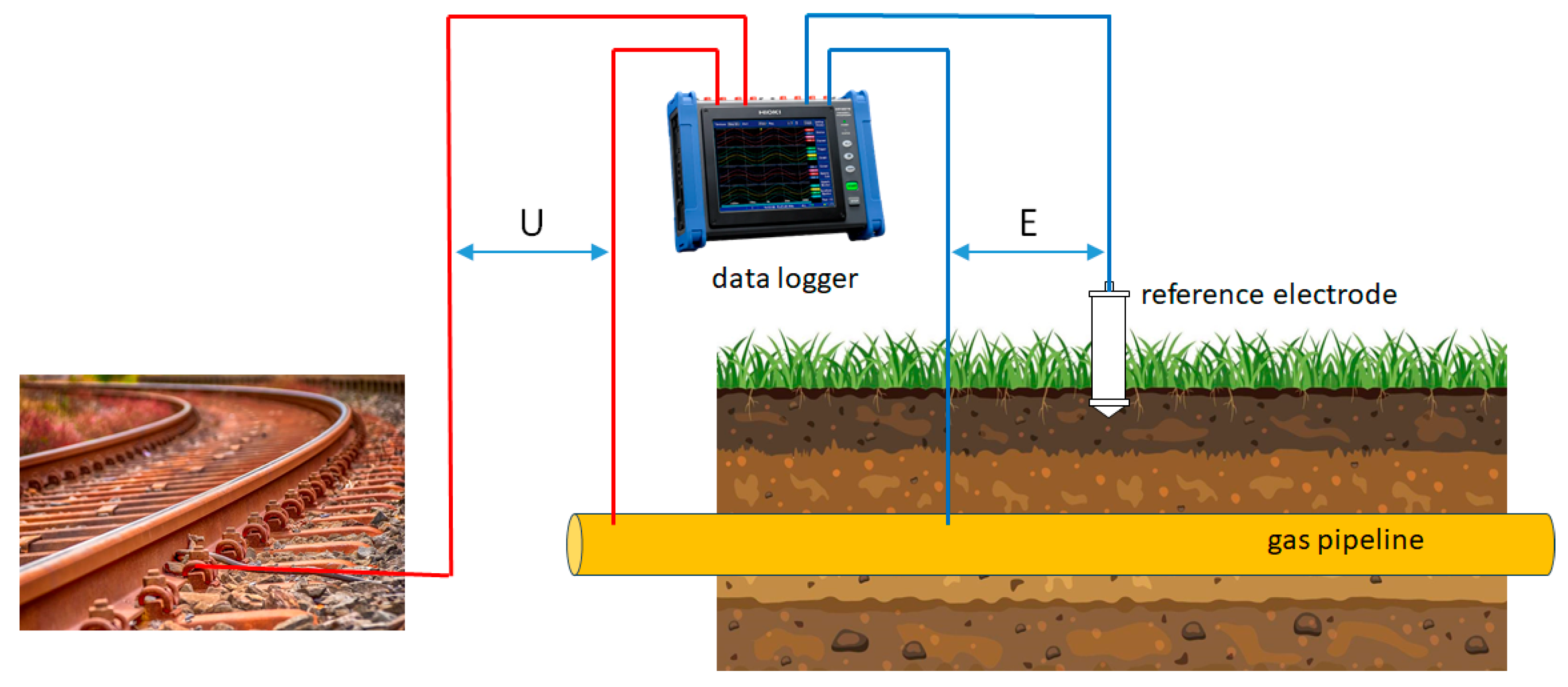 This method examines the correlation between changes in two physical and electrochemical quantities related to the impact of stray currents from DC electric traction systems. One of them is a physical quantity related to the cause of the impact of stray currents on gas pipelines—it is the voltage U of the gas pipeline relative to tram or railway traction rails, which is directly proportional to the intensity of stray currents flowing through the gas pipeline. The second quantity is the electrochemical effect of stray currents, i.e., changes in the potential E of the gas pipeline due to induced cathodic and anodic polarization. Next, the relationship E = f(U) is analyzed. The measurement system scheme is shown in Figure 7. Measurements are taken during periods of maximum impact, i.e., during the morning and afternoon rush hours. The measurement duration should be no less than 20 min for tram traction and 30 min for railway traction. The sampling frequency of the measured signals should be at least 4 readings per second []. In special cases, 24-h measurements are carried out [].