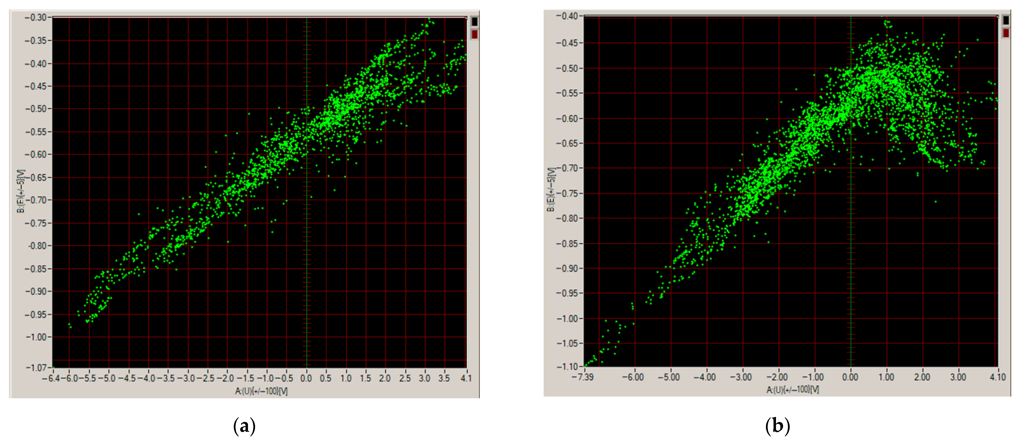 The correlation method allows the assessment of the effectiveness of stray current protection systems, the most basic of which is polarized electrical drainage. The graph in Figure 10a was obtained under conditions without the protection of a gas pipeline, while the graph in Figure 10b was obtained after switching on polarized electrical drainage. In the positive voltage range, after exceeding the forward voltage of the silicon diode (approx. 0.7 V), a typical bend in the correlation graph towards lower potential values is visible. This indicates the correct operation of the diode and the correct operation of the polarized electric drainage, which reduces the risk of corrosion of the gas pipeline caused by stray currents.