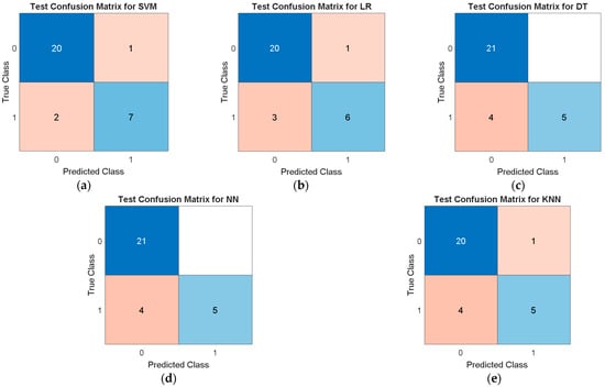 The confusion matrices on the independent test set (n = 30; 9 positives/21 negatives) for models: (a) SVM, (b) LR, (c) DT, (d) NN, (e) KNN.