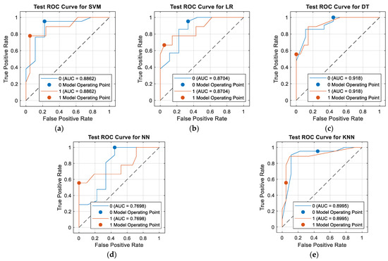 ROC Curves on the independent test set (n = 30; 9 positives/21 negatives) for developed models: (a) SVM, (b) LR, (c) DT, (d) NN, (e) KNN.