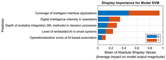 Global Shapley value analysis was performed for the top-performing SVM with an RBF kernel. As shown in Figure 3, the mean absolute SHAP values (|SHAP|) indicate that Coverage of intelligent interface applications is the most influential indicator for the predicted probability of energy-conscious IT governance. The next most influential indicators are Digital intelligence intensity in operations and Depth of analytics integration (ML methods), whereas Level of embedded AI in smart systems and Operationalization score of AI-based automation exhibit comparatively smaller contributions. SHAP values were computed in MATLAB R2024a using training-fold data as the background and held-out observations for explanations to avoid leakage. Reported values summarize mean |SHAP| across observations and do not imply causality.