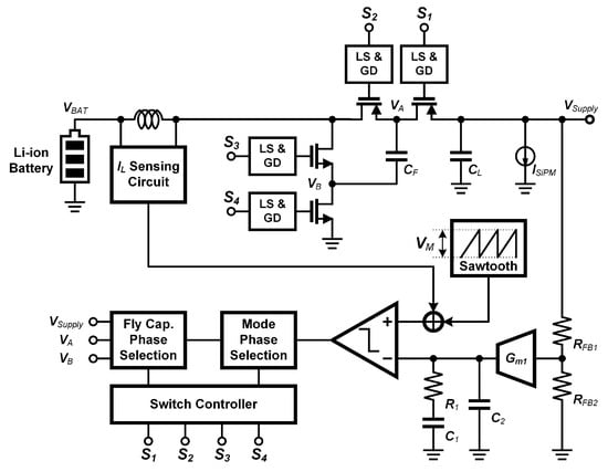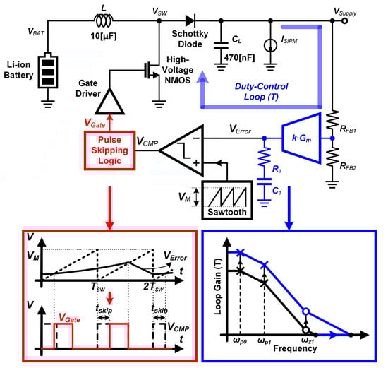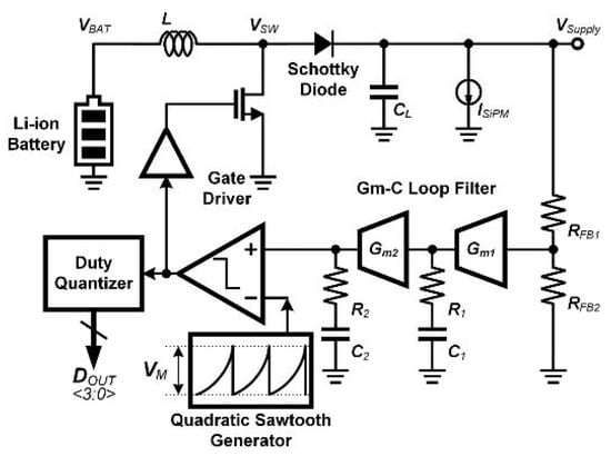 - Kim, W.; Noh, H.; Jeon, H. A High-Efficient, Wide Loop BW Boost Converter IC with Pulse Skipped Switching and Gm-Boosted Compensator for Light-Load SiPM. In Proceedings of the 2025 IEEE 68th International Midwest Symposium on Circuits and Systems (MWSCAS), Lansing, MI, USA, 10–13 August 2025; pp. 1054–1058. [Google Scholar]