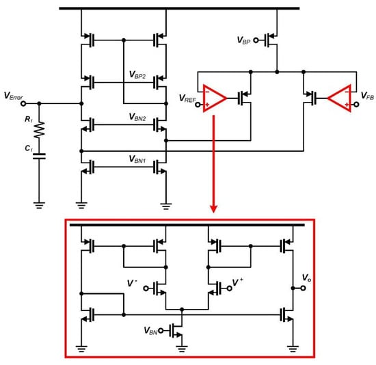 To overcome the limited loop bandwidth inherent in discontinuous conduction mode (DCM), the proposed design employs a Gm-boosted compensation technique, as depicted in Figure 6. The compensator is based on a folded cascode OTA, which is a common choice in Gm-C feedback networks due to its high output impedance and stable operation. However, a conventional OTA provides limited transconductance, which constrains the loop gain and bandwidth of the system.