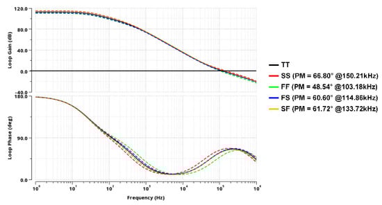 Furthermore, to verify the robustness of the control loop against process variations, extensive corner simulations were conducted. As shown in Figure 9, the loop gain and phase were evaluated across five process corners. The results demonstrate that the converter maintains stable operation across all conditions. The phase margin remains above 48.5° even in the worst-case (FF) corner, ensuring loop stability. The crossover frequency varies from approximately 103 kHz to 150 kHz, confirming that the wide bandwidth is consistently achieved. This analysis confirms that the proposed design is robust and insensitive to manufacturing process variations.