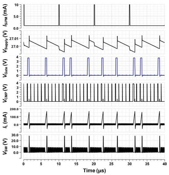 To evaluate the converter under practical operating conditions, a radiation-induced charge injection model was applied. As illustrated in Figure 10, a transient 10 mA current pulse with 200 ns duration was periodically introduced at the output to emulate photon-induced charge bursts. In the conventional boost converter, such perturbations often lead to large voltage deviations and prolonged recovery. In contrast, the proposed design quickly absorbs the injected charge and restores the output within microseconds, with minimal ripple. This stable biasing ensures accurate photon counting in SiPM detectors and prevents distortion of sensor outputs in chemosensor applications.