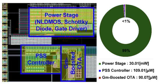 Layout of the proposed boost converter IC implemented in a 250 nm BCD process and chart of power consumption of each block.