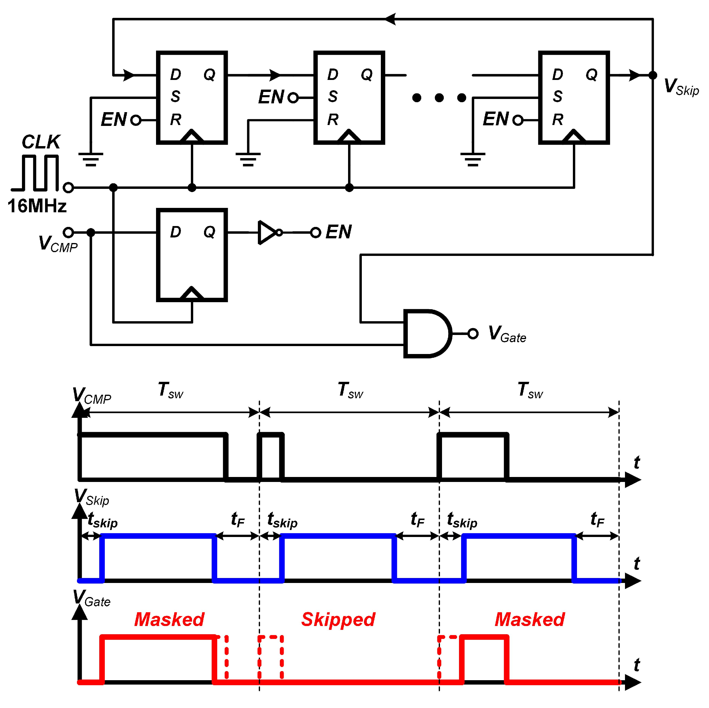 The use of a shift-register-based digital PWM structure provides two advantages. First, it allows precise adjustment of the skipping ratio (e.g., skipping every second or third pulse) according to the magnitude of the error voltage. This fine-grained control ensures that the converter can maintain stable regulation even under sub-milliampere loads. Second, the digital implementation offers robustness against process and temperature variations, which can otherwise introduce nonlinearity in analog control schemes.