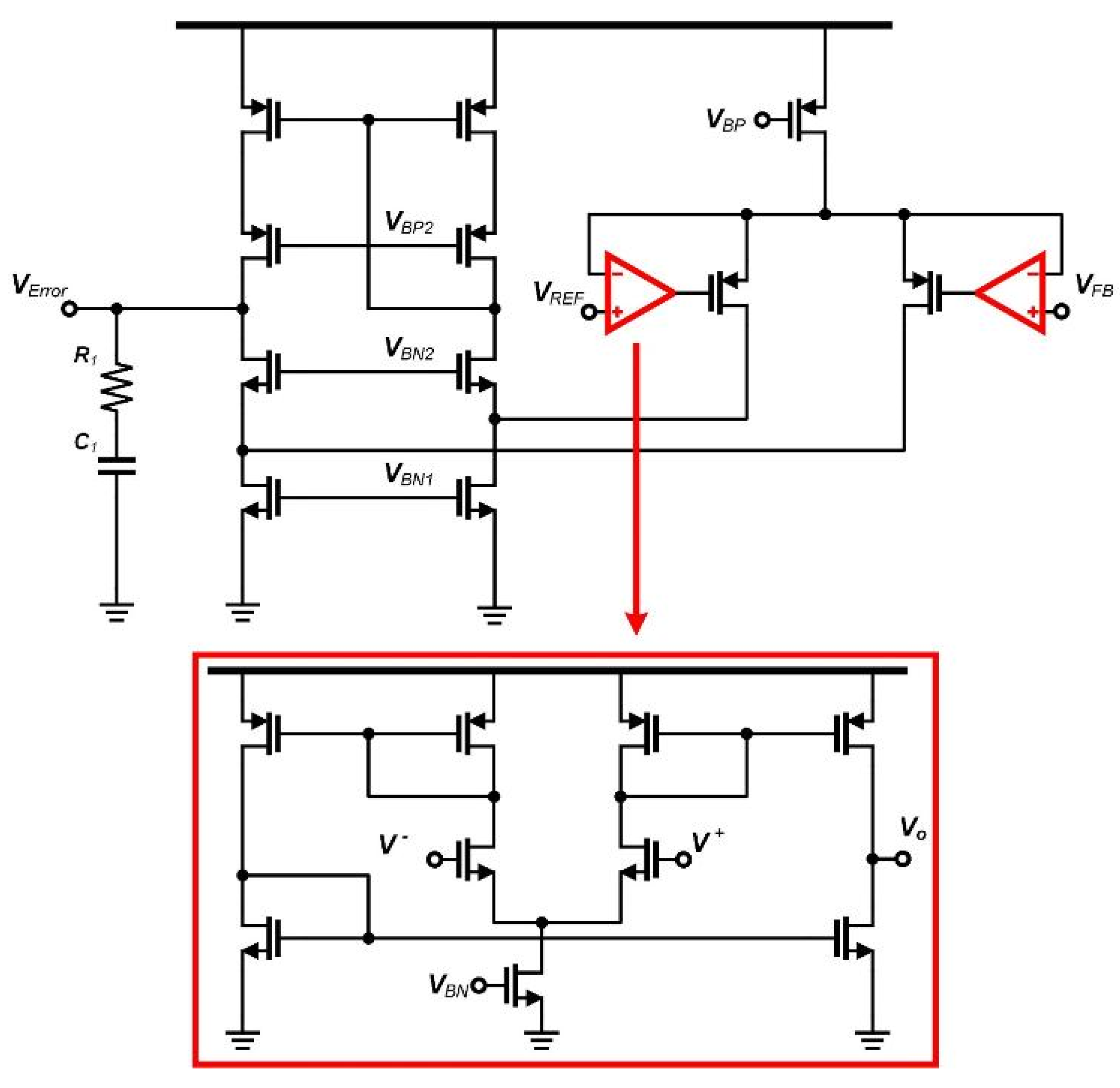 Figure 6. The compensator is based on a folded cascode OTA, which is a common choice in Gm-C feedback networks due to its high output impedance and stable operation. However, a conventional OTA provides limited transconductance, which constrains the loop gain and bandwidth of the system.