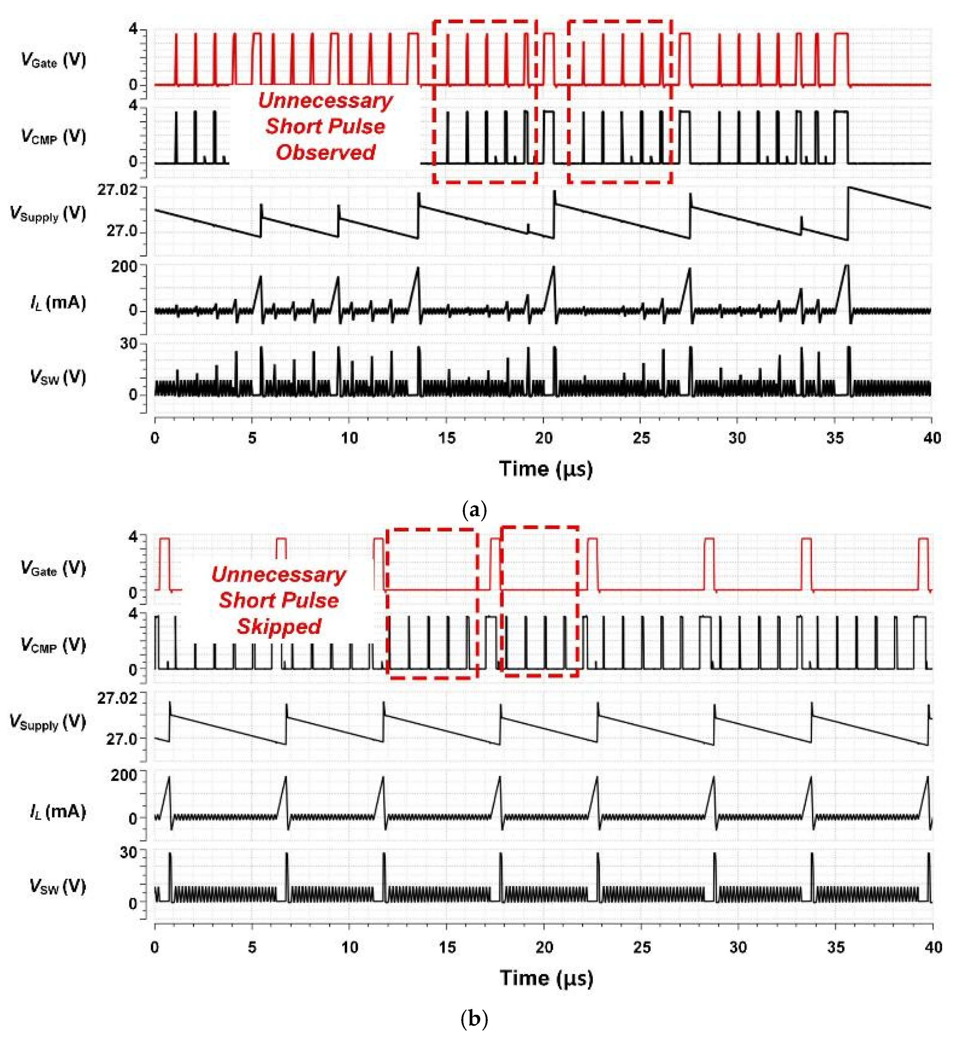 Figure 7 compares the transient response of a conventional fixed-frequency boost converter with that of the proposed pulse-skipped switching (PSS) scheme under ultra-light-load conditions (<1 mA). In the conventional design, the switching node continues to toggle every cycle, leading to unnecessary energy dissipation and slow recovery of the output voltage. In contrast, the PSS approach selectively skips switching cycles once the error amplifier output indicates that the bias is well regulated. As shown in the waveform, the proposed method reduces switching events by two-thirds while maintaining stable output regulation. This translates into a reduction of switching loss by approximately 66%, leading to markedly higher efficiency in standby or low-count-rate scenarios where light-load operation dominates.