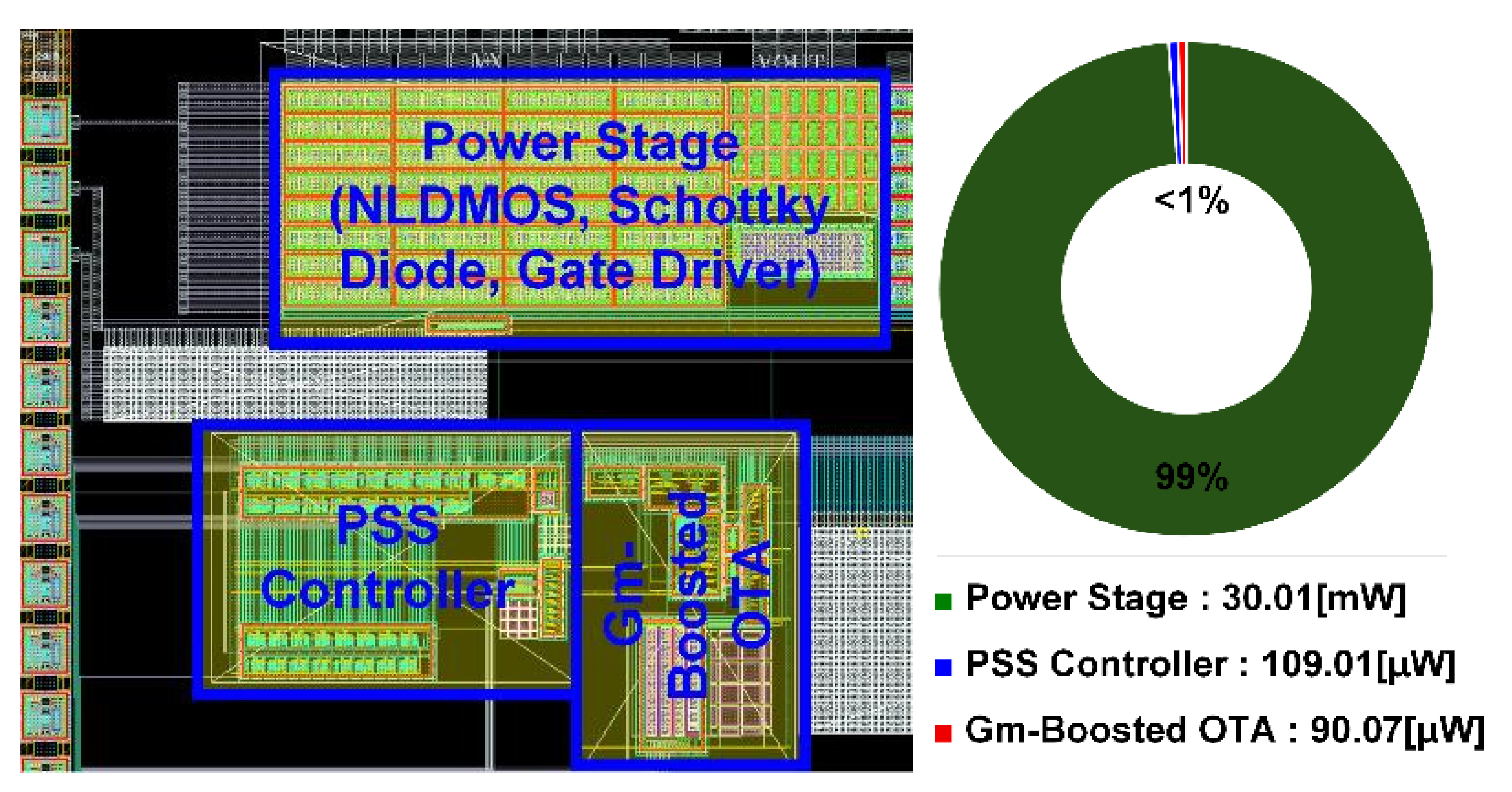 Figure 11 shows the layout of the proposed boost converter IC implemented in a 250 nm BCD process. The active area measures approximately 0.96 × 0.58 mm