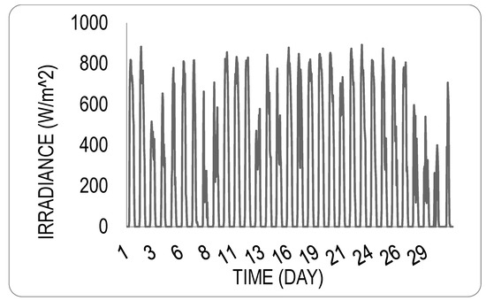 The simulation of the PV system model was implemented in MATLAB/Simulink (version R2025a, MathWorks Inc., Natick, MA USA). The simulated system, illustrated in Figure 2, consists of one setup with an ultrasonic device and both setups with a photovoltaic (PV) array, a solar charge controller, a DC-DC converter, a lead-acid battery, and a DC load with varying load demands. The solar irradiance input, as shown in Figure 3, is modeled after the environmental data of May 2025 obtained via the Open-Meteo Satellite Radiation API, a publicly accessible web-based API that provides weather and climate variables derived from satellite and model-based sources [27]. Additional parameters of the system components are presented in Table 1.