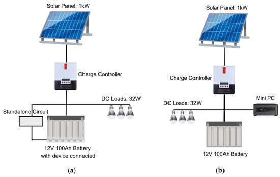 Comparison of solar-powered systems with different device integrations. (a) Standalone circuit integrated with a 12 V 100 Ah battery for direct device connection. (b) Mini PC integrated system powered by a 12 V 100 Ah battery. Both setups use a 1 kW solar panel and 32 W DC loads, managed by a charge controller.