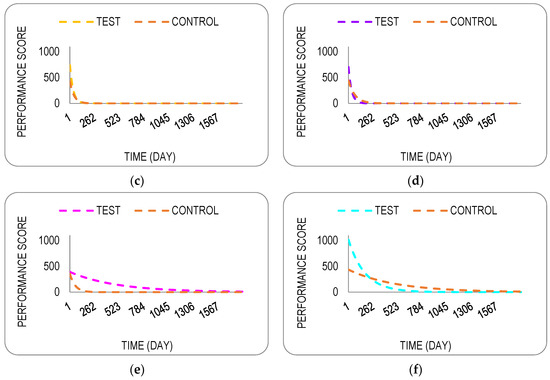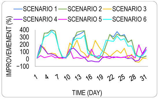 The data summary in Table 4 highlights that in scenarios 1 and 2, the test system demonstrates consistent superiority, with improvements peaking at 395% and 405%, respectively. In scenario 3, improvements are more irregular, with a notable maximum of 259% including negative values toward the end of the cycles. For scenarios 4 and 5, the improvement trend is less stable, with moderate gains but also multiple days of negative improvement. Meanwhile, scenario 6 shows the most balanced result, while sustaining improvement above 300%. This study incorporates both optimized and realistic load scenarios to evaluate system performance comprehensively [34].