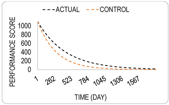 Long-term performance was evaluated using the accumulated performance score defined in Equation (10). The results in Table 5 indicate that the ultrasonic system consistently outperformed the control, with improvements ranging from 29.32% (Scenario 4) to 124.53% (Scenario 6). Experimental validation from the DC House microgrid confirmed these improvements, recording a 49.30% gain. The projected degradation trends over a five-year horizon, illustrated in Figure 9, further demonstrate that the ultrasonic system sustained higher performance levels compared to the control.