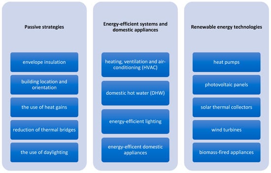 Nearly zero-energy buildings (NZEBs) and nearly zero-carbon buildings (NZCBs) provide promising options to reduce the environmental impact of the building sector. Building optimization is a promising technique for evaluating the design choices of NZEBs and NZCBs. It has been adopted for selecting the optimal solution for achieving zero energy performance by optimizing an objective function related to energy (e.g., thermal loads, renewable energy generation, and energy savings), environment (e.g., CO2 emissions), and/or economy (e.g., life-cycle cost, net present value, and investment cost) []. As a result, both NZEBs and NZCBs use energy-efficient technologies (HVAC, lighting, and appliances) and utilize renewable energy sources (RES). Furthermore, NZCBs are achieved when the embodied carbon emissions from producing and transporting construction materials are offset []. Figure 2 illustrates the primary steps necessary to achieve the NZEB standard.