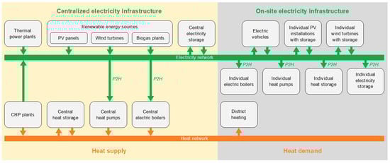 Considering the potential for coupling various generation and storage technologies, the high potential for connecting VRE (including photovoltaic panels and wind turbines) with P2H is evident. P2H technologies are solutions that convert electrical energy into thermal energy for use in buildings and industries. Due to their ability to integrate VRE sources into the power system, these technologies are considered key enablers of the low-carbon energy transition. P2H systems utilize surplus electricity from renewable generation, particularly during periods of low demand, to reduce fossil fuel consumption and enhance overall energy system flexibility. Technological maturity, cost-effectiveness, and scalability make them especially suitable for integration with low-temperature district heating and cooling networks, which are increasingly applied in NZED concepts. Moreover, P2H contributes to grid stability by absorbing excess renewable electricity during periods of high generation, while simultaneously reducing reliance on fossil-based heat production [,]. The general idea of integrating VRE, STES, and P2H solutions into the district network is shown in Figure 3.