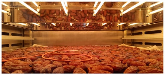 The next P2H technology, infrared heaters, has been widely adopted in various engineering applications due to its low cost, high energy efficiency, and rapid response time. It has been successfully implemented, e.g., in food processing, food drying, and metal forming [,,]. Unlike conventional heating methods, IR heating transfers energy directly through radiation, enabling faster heating rates, reduced energy losses, and more precise temperature control. In the food industry, IR heating is particularly advantageous because it not only provides efficient thermal processing but also exerts a sterilizing effect by inactivating microorganisms, thereby improving both safety and quality []. The example of infrared fruit drying using radiant heaters is shown in Figure 5.