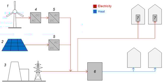 The idea of the system connecting heat pumps (HP) with a PV installation and wind turbines, where 1—wind turbines; 2—PV panels; 3—power plant; 4—AC/DC converter; 5—inverters; 6—central heat pump; 7—individual heat pumps.