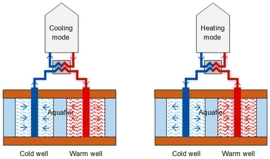 ATES is a technology that uses aquifers as natural underground reservoirs to store and recover thermal energy seasonally, enabling year-round heating and cooling. ATES systems operate based on the porosity and permeability of aquifer formations, which facilitate the circulation and retention of groundwater within the pore network of the geological medium. In the summer, excess heat is transferred to the groundwater and injected into a warm well where it is stored underground. Conversely, during winter operation, water, naturally or mechanically cooled, is injected into the cold well. Thermal demand is met by pumping from the proper well—warm water in winter for heating, cold water in summer for cooling. Wells are located far apart from each other, so their thermal plumes do not overlap. Figure 9 provides a schematic representation of ATES operation.