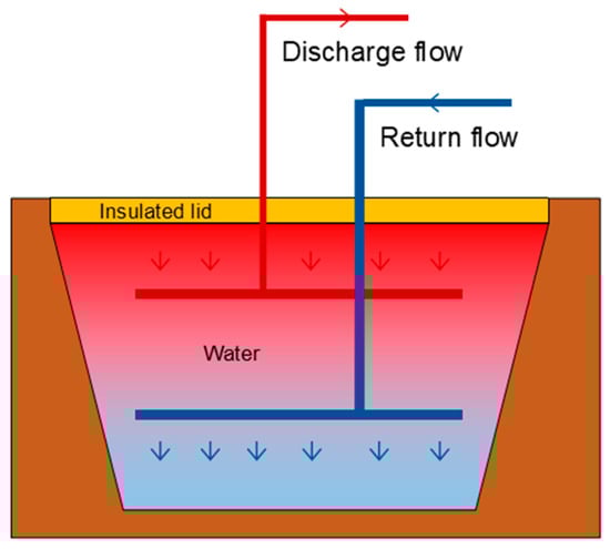PTES is an artificial underground storage system typically constructed at depths of 5–15 m. The storage volume is created by an excavated pit, where the bottom and inclined sidewalls form the reservoir, eliminating the need for additional structural support. The ground-level surface is sealed with either a fixed or a floating cover to minimize heat loss []. In PTES systems, both liquid and liquid–solid storage media can be employed. The latter, typically consisting of a water–gravel mixture with a gravel content of 60–70%, provides greater structural stability. However, because gravel has a significantly lower heat capacity than water, the overall storage capacity of the mixture is significantly reduced. Consequently, a PTES using a water–gravel medium must be approximately twice the size to store an equivalent amount of energy []. The general idea of PTES technology is shown in Figure 11.