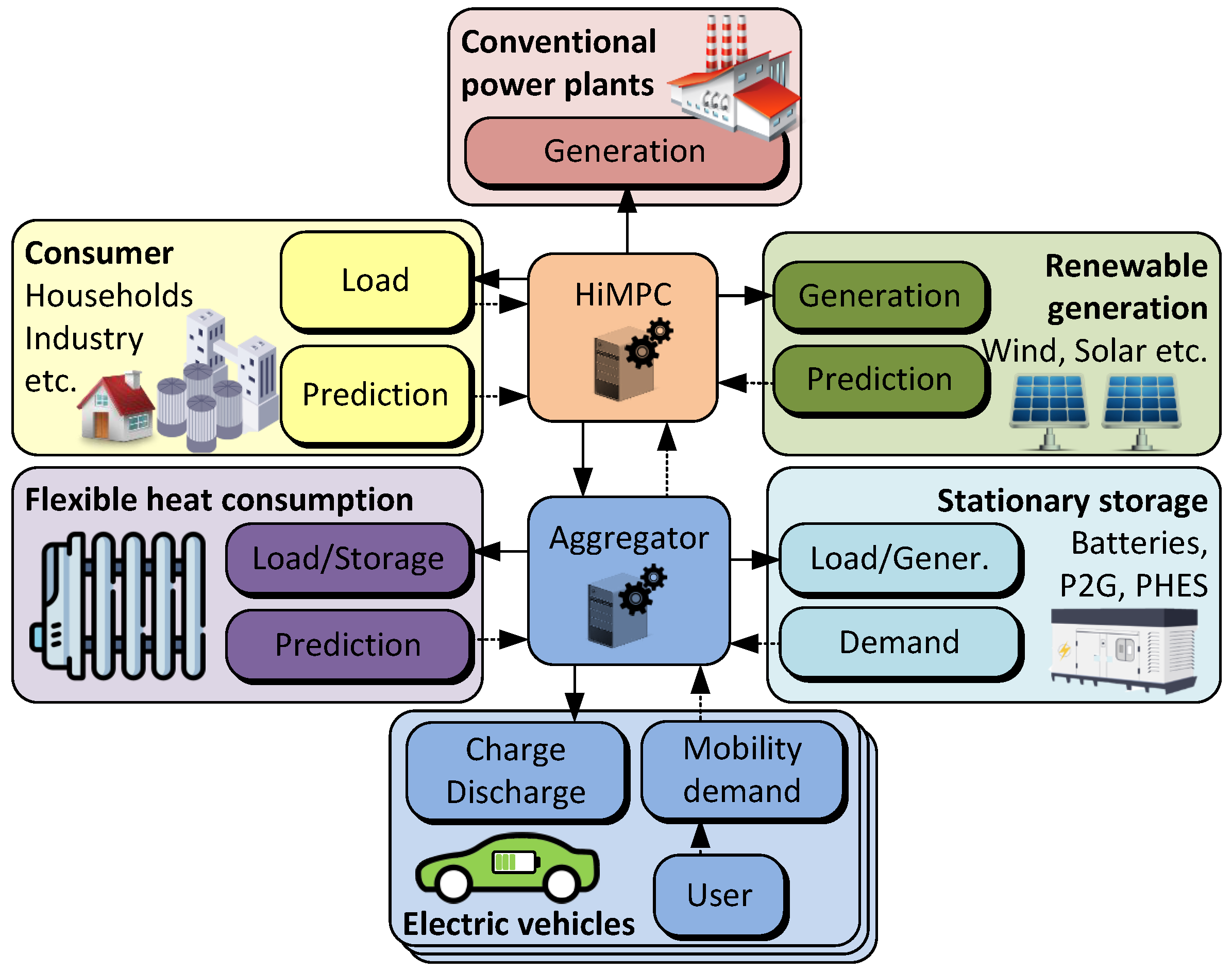 Daily moving averages of wind, photovoltaic generation, and consumption are provided to the transfer power calculator, which returns setpoints for the transfer powers. Using these data, each zone’s HiMPC computes control signals (input vector ) for power adjustments within the zone and sends them to the energy system calculator. The energy system considers inter-zone couplings, updates the system state, and feeds the information back to the control loop.
