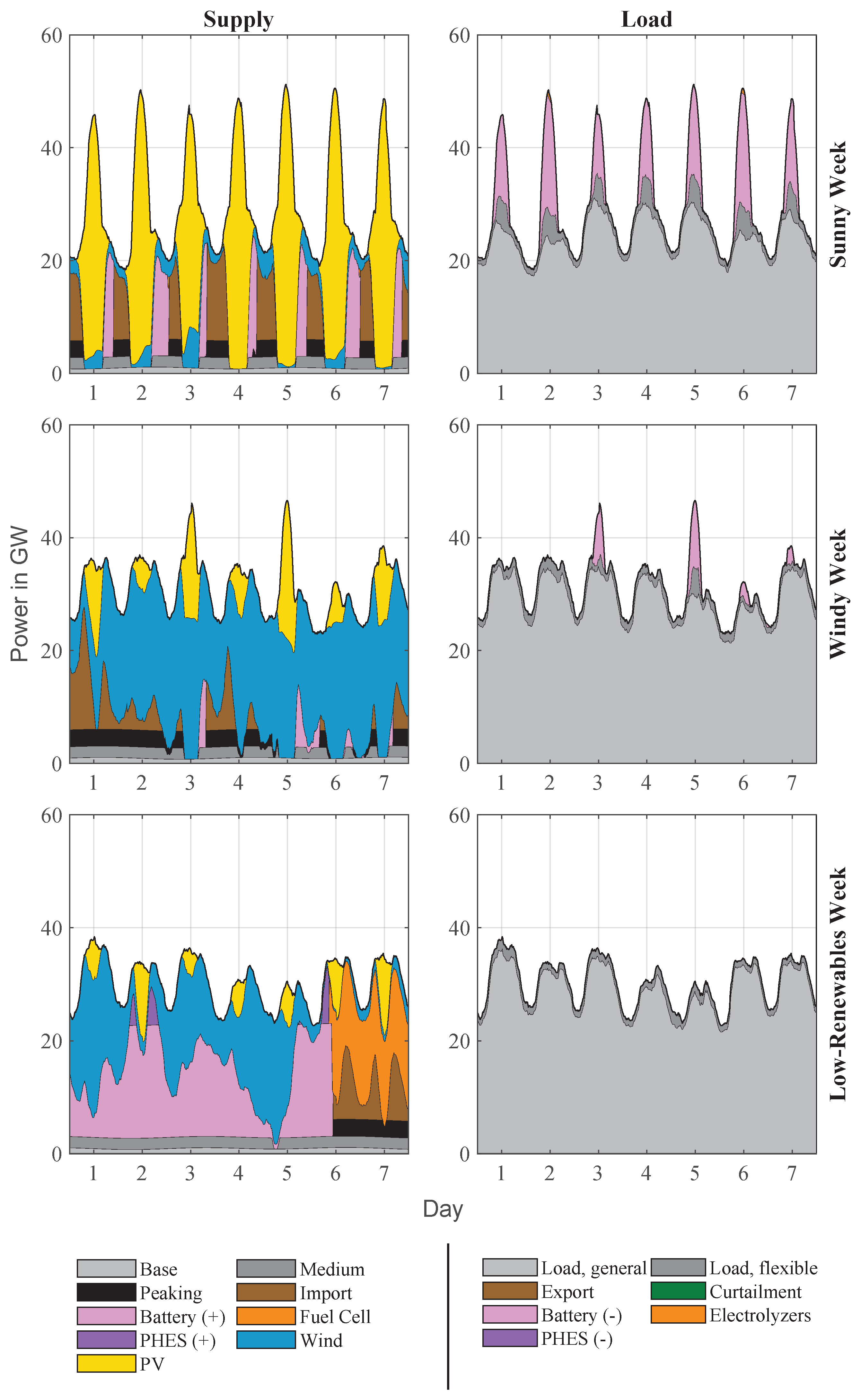 In the model, the combination of aggregated fuel cells, electrolyzers, and hydrogen storage addresses long-term supply–demand imbalances. Ramp-up times for these systems are set at two hours to account for the extended time needed to reach operational temperature and to prevent rapid fluctuations in operation. In the cost function, the hydrogen storage system’s state of charge is given a low weighting and is initialized at a low level. The simulation is mainly used to estimate maximum storage capacity and assess potential import needs or surplus generation. Detailed parameters are provided in