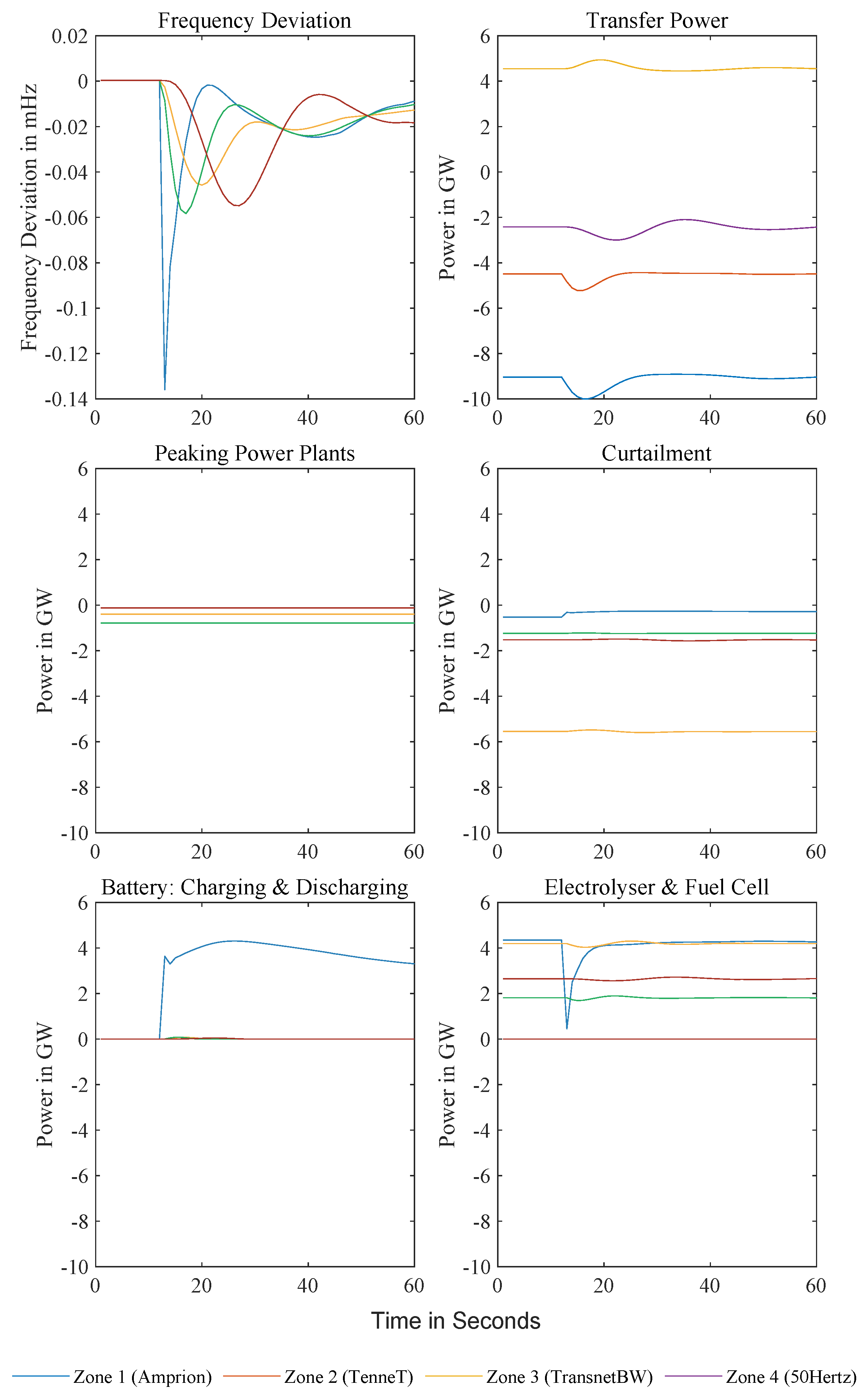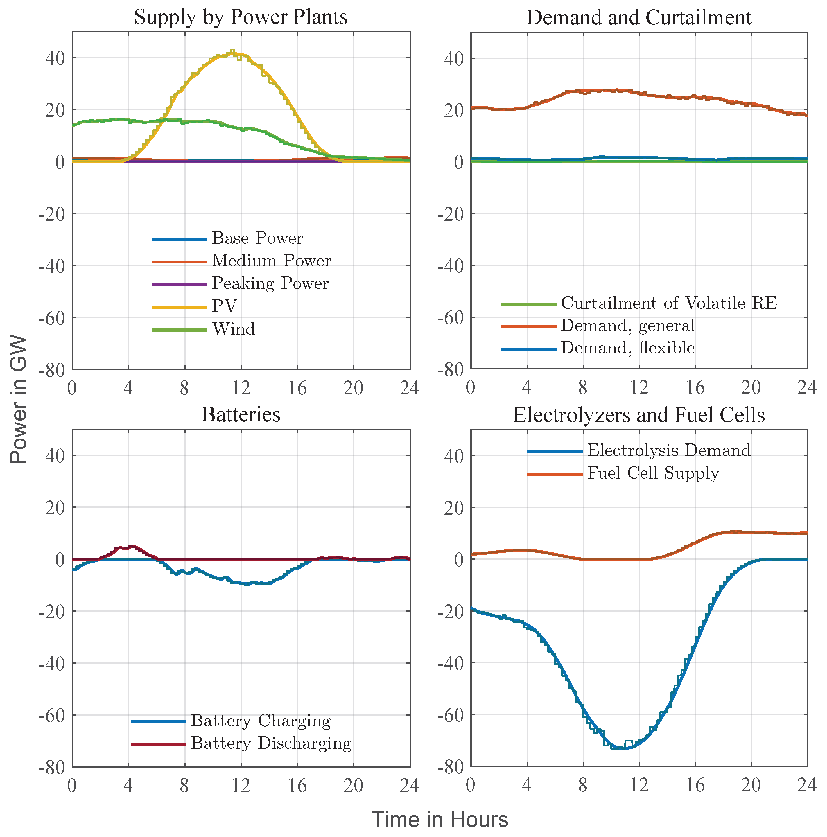 Conventional power plants play a significant role in today’s energy system and partially remain key as gas-fired plants powered by hydrogen from surplus renewable energy in the future scenario. For the MPC calculations, the constraints imposed by maximum power output and the duration of ramp-up and ramp-down processes are particularly relevant. The calculation of power plant output
