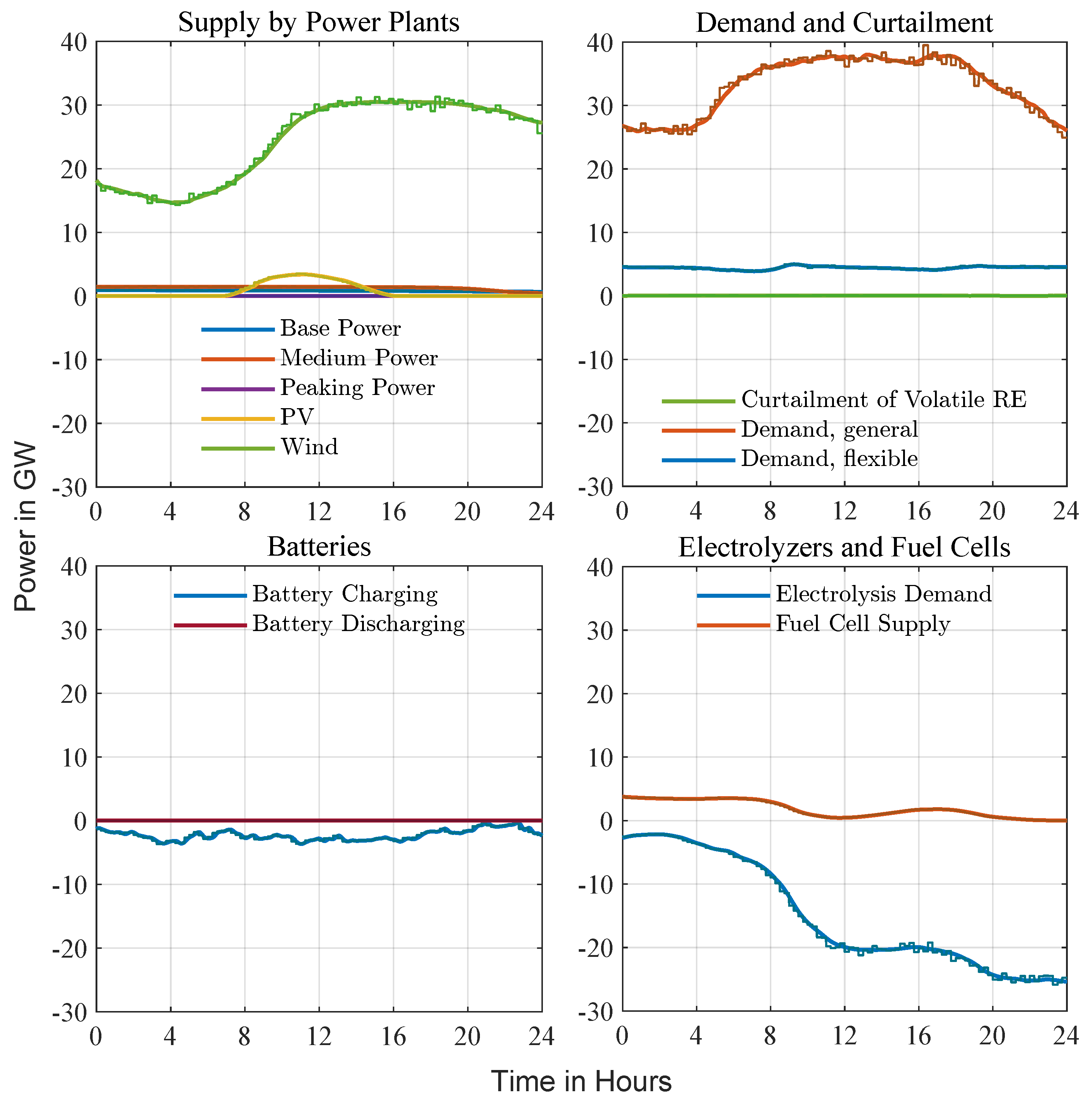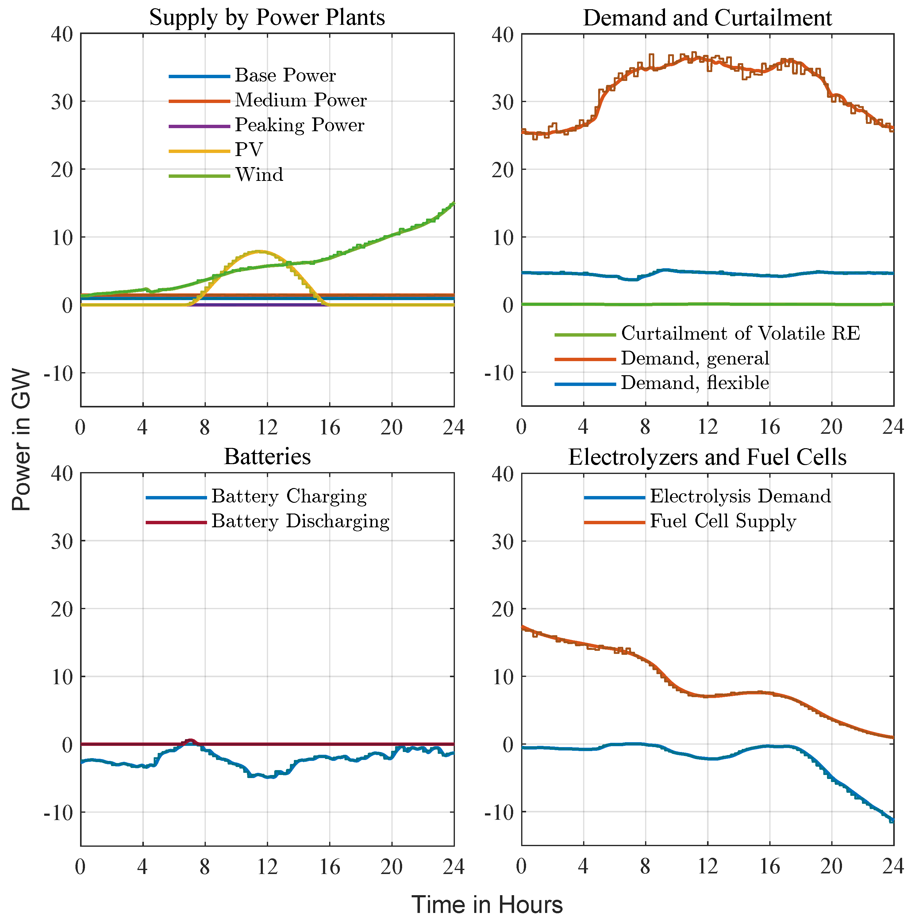 The modeling of electrolyzers and fuel cells in this study parallels the approach used for batteries, assuming a linear process where electrolyzers produce hydrogen, which is stored and later converted back into electricity using fuel cells. Installed capacities follow NEP’s Scenario A baseline and are incrementally increased in the simulation until electrolysis energy demand can be met domestically, yielding a self-sufficient system.