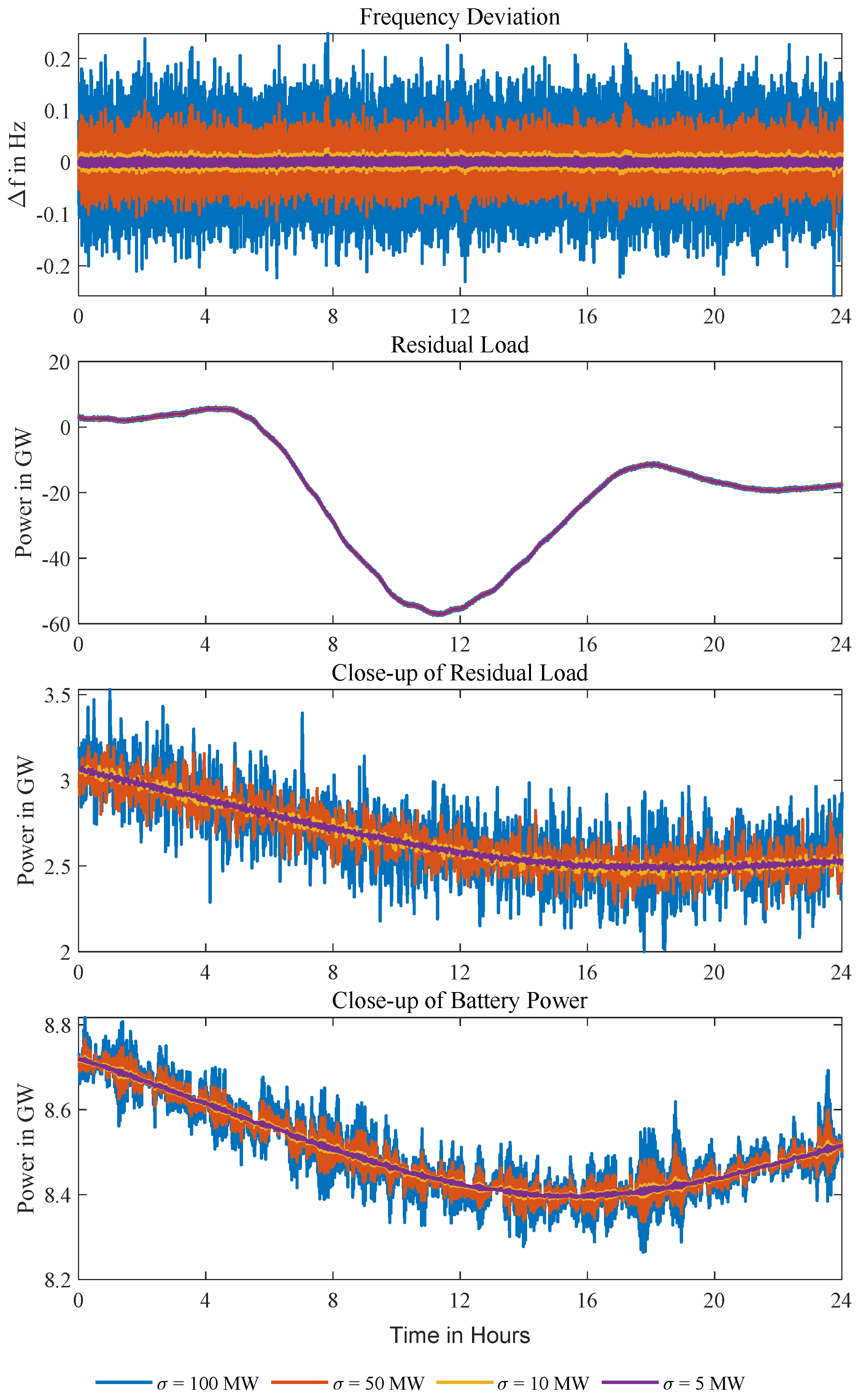 Level 2 MPC combines primary and secondary control. It runs at a 1 s sampling time with a 5 s prediction horizon. The fast loop applies a droop-like action proportional to the instantaneous frequency deviation to arrest transients (primary role) and, in parallel, an integral correction that drives the steady-state frequency error toward zero within actuator limits (secondary role). A sampling time of 1 s is intentionally coarse; sub-second sampling on the order of a few hundred milliseconds or less would better suit low-inertia conditions. An optional intermediate third layer with a sampling time of a few tens of seconds can further smooth corrections between the 1 s loop and the 15-min scheduler. We keep 1 s/5 s here to limit runtimes; for the types of questions this framework is intended to support—e.g., storage sizing, ratios of storage power to plant capacity, and sensitivity to forecast quality—this simplification does not limit its applicability, although we do not perform those analyses here.
