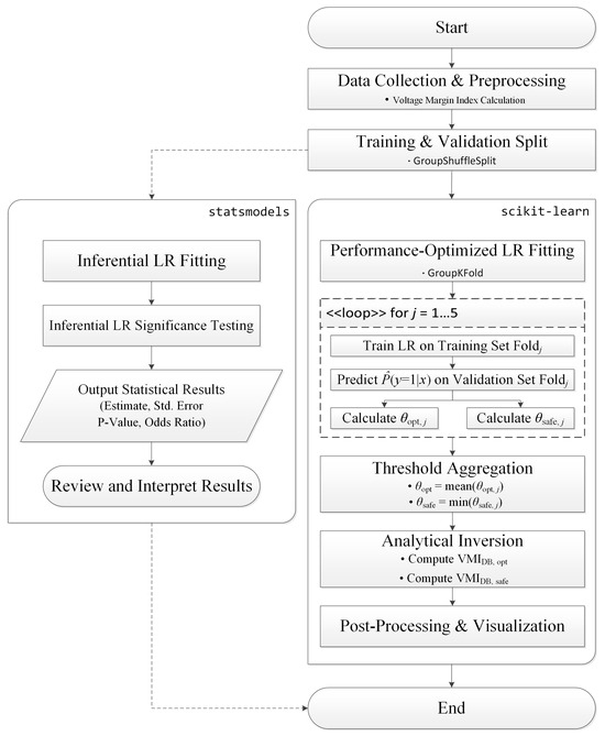 Substituting θopt produces the performance-oriented VMI decision boundary (VMIDB,opt), while substituting θsafe produces the safety-oriented VMI decision boundary (VMIDB,safe). Because the ℓ2-penalized estimate yields ω < 0, the logit slope remains negative: lower θ corresponds to higher (safer) VMI decision boundaries, consistent with the interpretation that increasing VMI strongly reduces violation risk. The overall workflow is summarized in the flowchart of Figure 1.