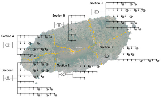 To assess the generality of the proposed framework, a simplified 22.9 kV model of Jeju Island’s distribution system was developed based on operating data from the Korea Electric Power Corporation (KEPCO). The model partitions the island into six service areas, denoted A through F, as shown in the single-line diagram in Figure 2. Each area is supplied by a single 154/22.9 kV 60 MVA substation, and all distribution lines are standardized using ACSR-160 mm2 conductors [38]. An aggregate load of 13 MW (0.95 power factor) is distributed across feeders in proportion to their node counts.