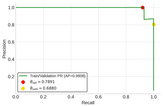 Operational criteria were established by first deriving two distinct thresholds from the training and validation sets via a 5-fold group cross-validation strategy. θopt was defined as the average of the fold-wise thresholds that maximized the F1-score, balancing precision and recall. θsafe was set to the minimum threshold across all folds that guaranteed zero false negatives (i.e., perfect recall), prioritizing risk aversion. These thresholds were then analytically inverted using Equation (10) to calculate their corresponding VMI decision boundaries. The final, aggregated values are summarized in Table 4. The threshold selection process is visualized in Figure 3 and Figure 4. The PR curve in Figure 3 shows excellent discrimination (AP = 0.9908).