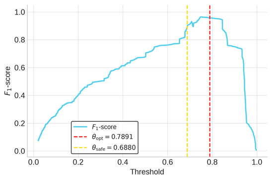 The red marker highlights the optimal balance point at θopt = 0.7891, while the yellow marker indicates θsafe = 0.6880, corresponding to perfect recall (recall = 1.0000). In Figure 4, which plots the F1-score against the threshold, the red dashed line at θopt lies within the F1 curve peak region, confirming that the model achieves high and robust performance from the cross-validation process.