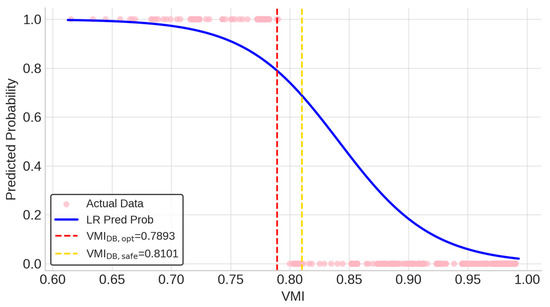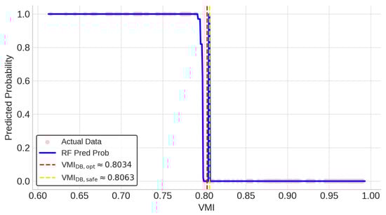 Under θsafe, both models achieve perfect recall, ensuring no violation events are missed. Although the RF model attains slightly higher overall accuracy (99.66% vs. 97.45%), this marginal difference is readily acceptable. The LR model’s safety-oriented boundary is VMIDB,safe = 0.8101, while the RF model’s boundary is VMIDB,safe ≈ 0.8063—values that differ only minimally. More importantly, the LR boundary is fully interpretable and derived analytically, enabling transparent risk management and straightforward sensitivity analysis—capabilities not afforded by the RF model’s complex, non-monotonic output.