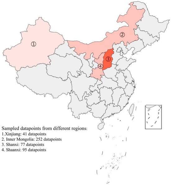 The coal quality index data used in this calorific value prediction were collected from the Inner Mongolia, Shanxi, Shaanxi, and Xinjiang Uygur Autonomous Regions in China. The coal samples are predominantly low-rank coal, including lignite, long-flame coal, non-caking coal, and so on. The sample collection locations are shown in Figure 1. In Figure 1, 252 datapoints of coal quality sample data were collected from Inner Mongolia, 77 datapoints from Shanxi, 95 datapoints from Shaanxi, and 41 datapoints from Xinjiang, for a total of 465 datapoints.